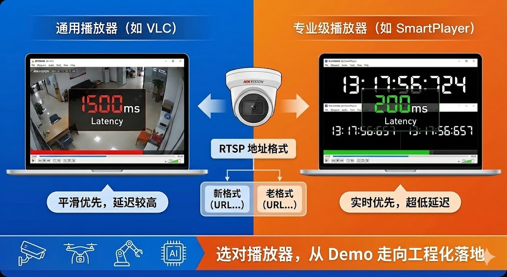 对于刚入门视频监控开发的工程师来说,如何正确获取网络摄像头(IPC)的 RTSP 地址,往往是项目落地时最先遇到的障碍之一。海康威视作为国内和全球安防市场份额领先的厂商,其摄像头 RTSP URL 格式存在新旧两套体系。本文将对海康 RTSP 地址规则进行系统梳理,并结合实际测试对比 VLC 与大牛直播SDK(SmartMediaKit)SmartPlayer 在播放延迟体验上的显著差异,帮助开发者完成从“能播放”到“好播放”的能力跃迁,为追求百毫秒级低延迟的工业级实时视频系统提供清晰选型参考。