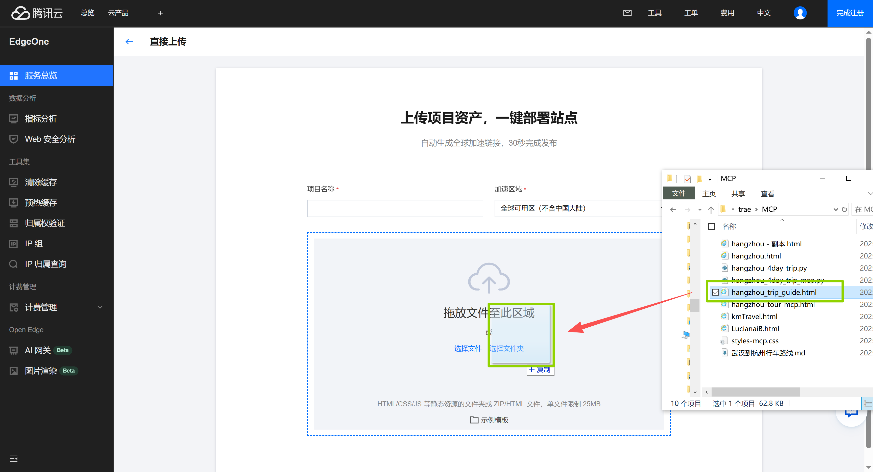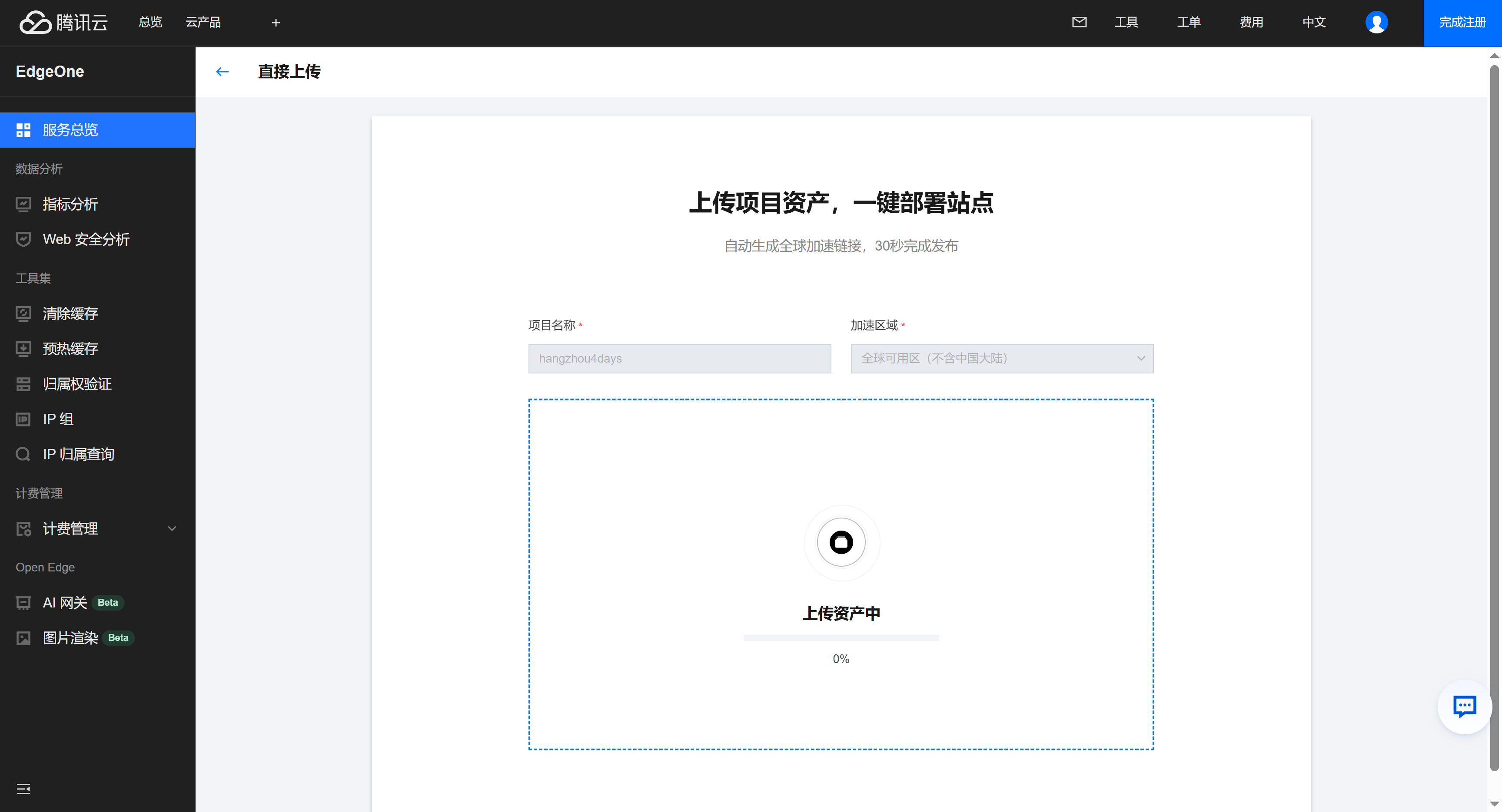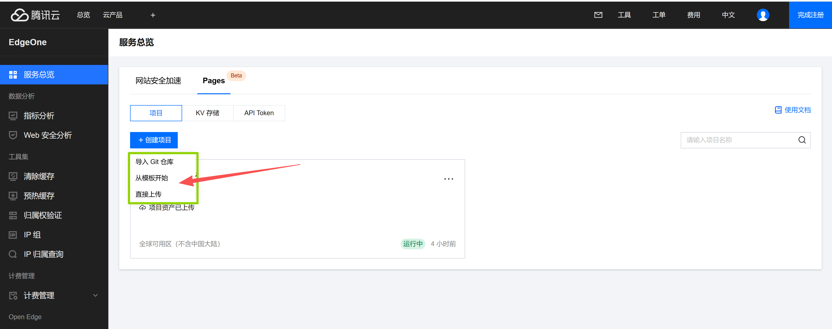接下来,我们将采用 EdgeOne Pages来进行简单部署;简单介绍EdgeOne Pages,它是基于 Tencent EdgeOne 基础设施打造的全栈开发部署平台,提供从前端页面到动态 API 的无服务器部署体验,适用于构建营销网站、AI 应用等现代 Web 项目。通过边缘网络全球加速,确保应用获得快速、稳定的访问体验。