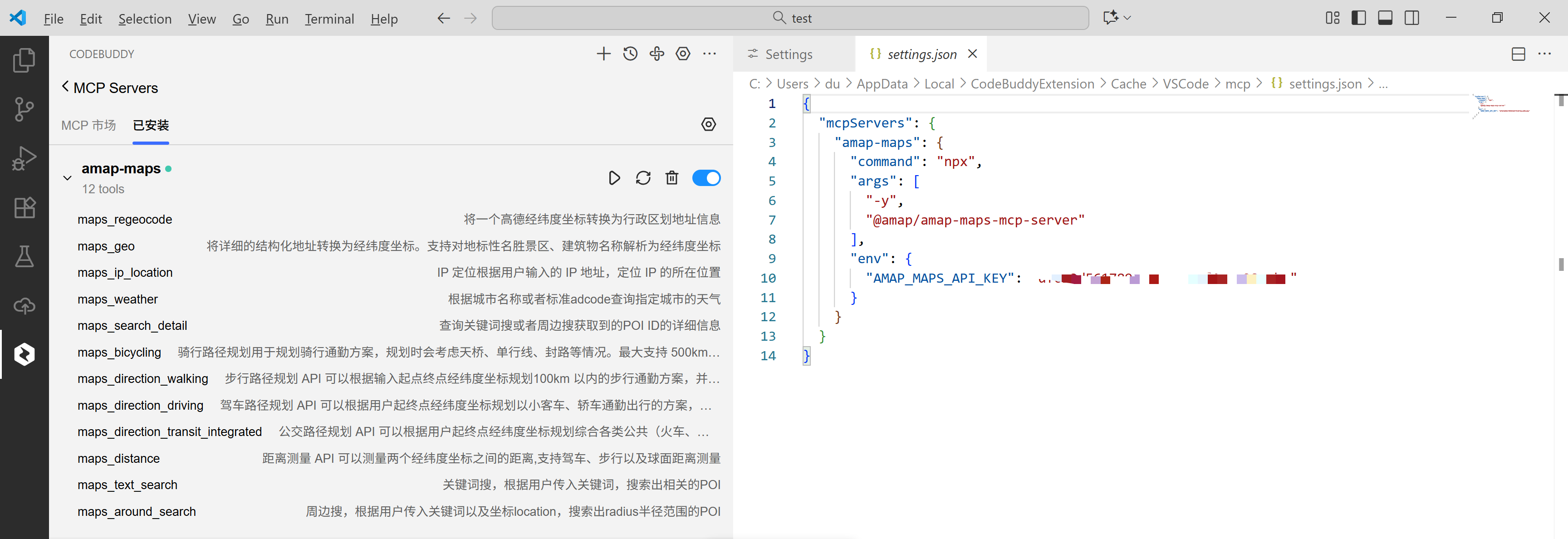 讲高德地图的MCP直接复制进去即可,注意key要替换成我们自己申请的key,保存后左侧会生成高德的MCP服务,并展示工具集: