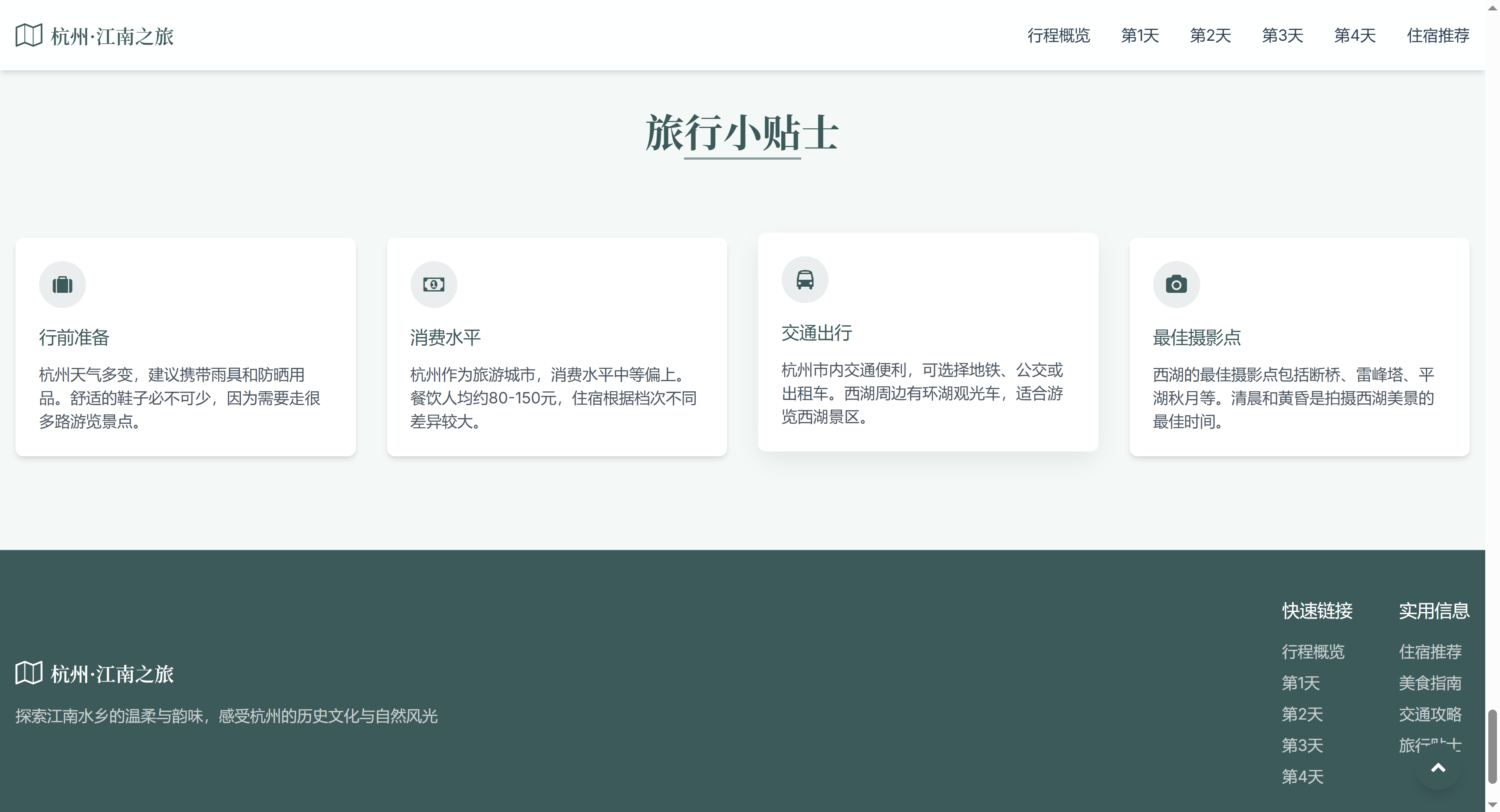 根据我的提示指令生成一个旅游攻略的页面,提示词“帮我规划一个杭州4日游的攻略的html,推荐美食、景点、住宿、以及各景点中间的接驳方案,界面风格采用江南水乡的风格、同时要有青春、旅行的元素,支持移动端观看”;