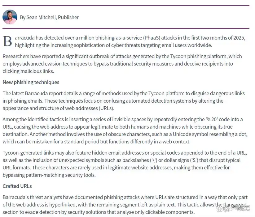 电子邮件仍是企业网络边界最脆弱的入口之一。根据Barracuda Networks于2025年9月发布的威胁报告,仅2025年前两个月,其全球传感器网络即捕获超过一百万起由“钓鱼即服务”(Phishing-as-a-Service, PhaaS)平台发起的攻击,其中以Tycoon平台为代表的新一代钓鱼工具展现出前所未有的URL构造复杂性。攻击者不再依赖简单仿冒(如micosoft.com),而是通过精心设计的链接结构,在保持人类用户感知“可信”的同时,绕过基于规则、签名或静态分析的安全网关。