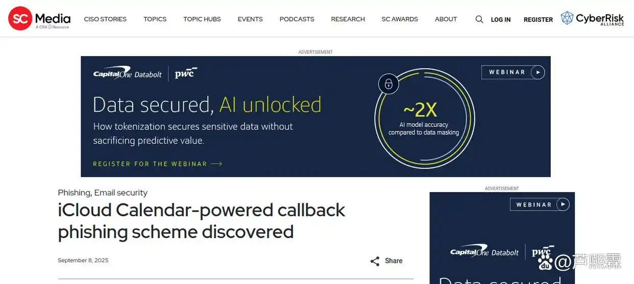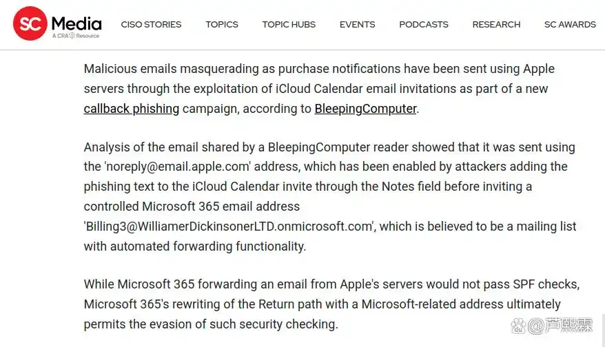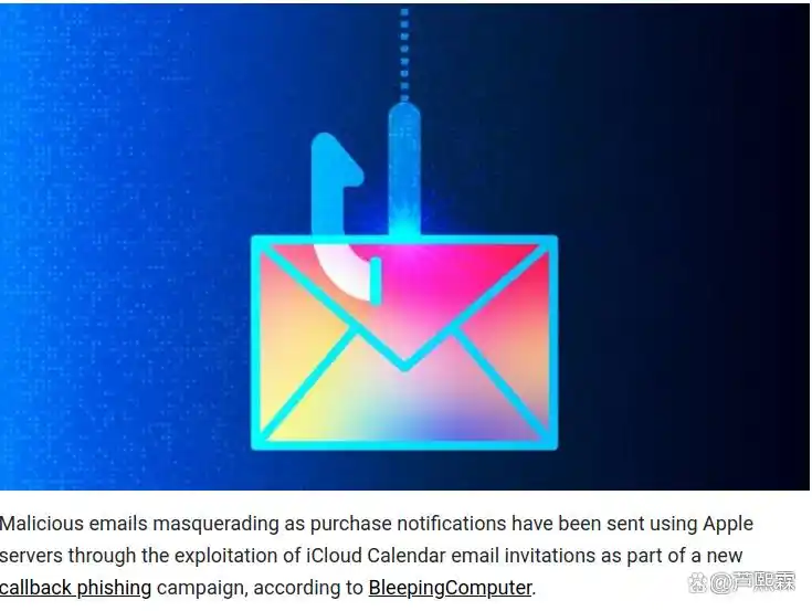 网络安全防御体系长期以电子邮件为核心防护对象。反垃圾邮件网关、URL信誉服务、附件沙箱等技术已显著压缩传统钓鱼邮件的生存空间。然而,攻击者的适应性演化从未停止。当主流通道受阻,其自然转向防御薄弱的替代媒介。2024年以来,多起高隐蔽性钓鱼事件被归因于非邮件载体,其中以Apple iCloud日历邀请为载体的“回拨型”钓鱼尤为突出。
