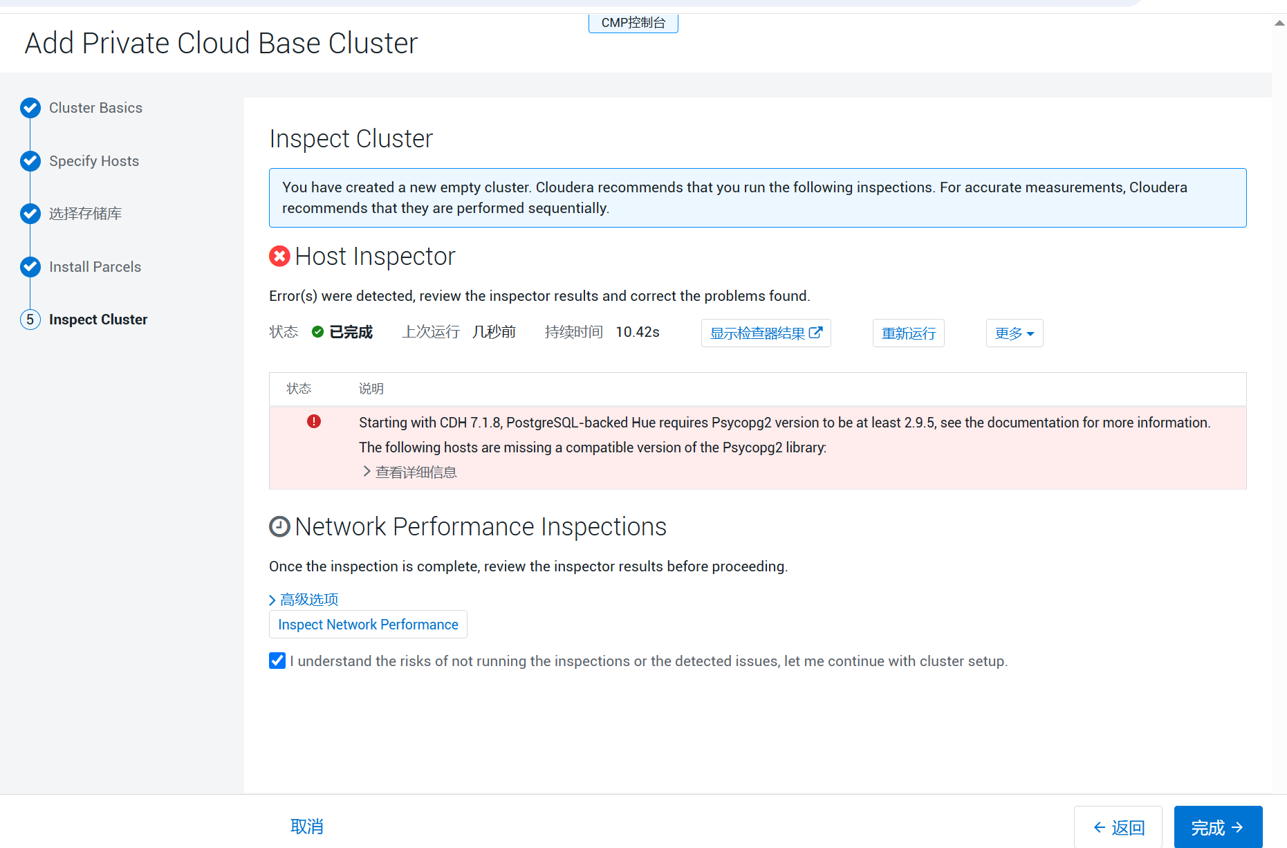 可以不用管,直接勾选“I understand the risks of not running the inspections or the detected issues, let me continue with cluster setup.”既可。