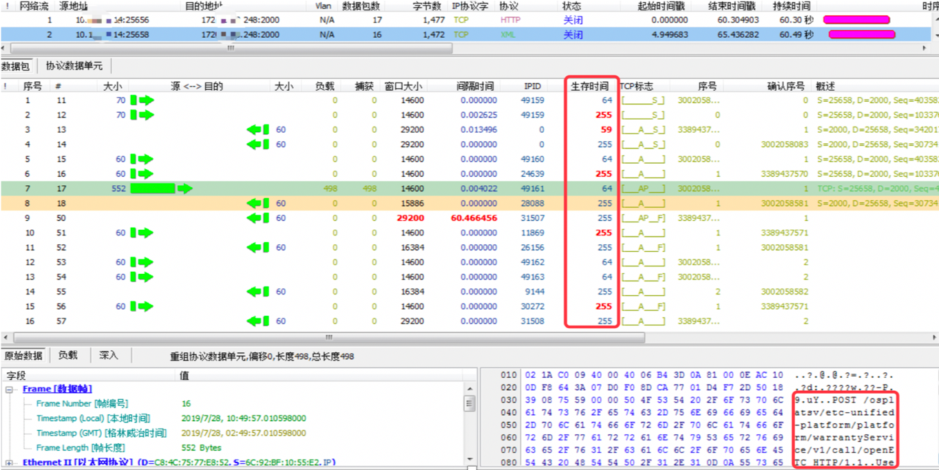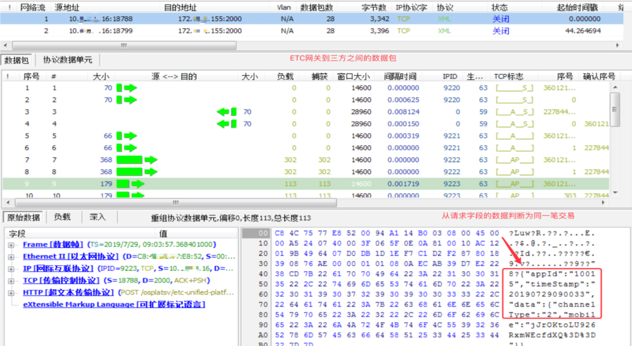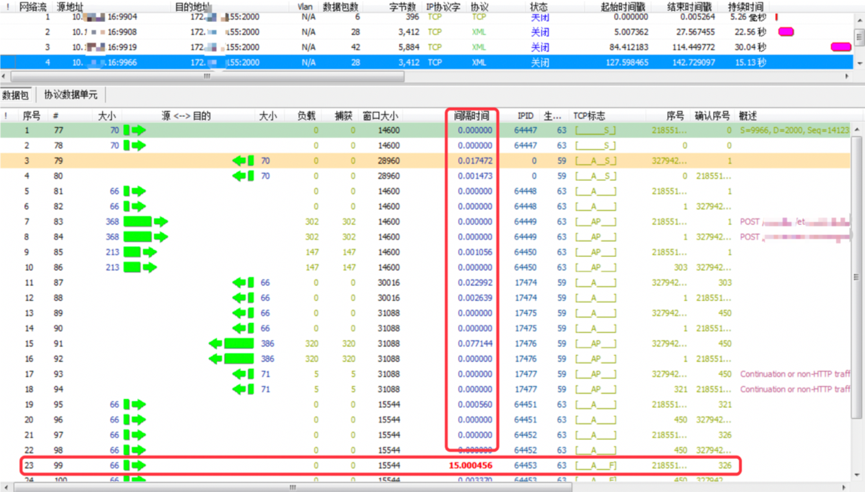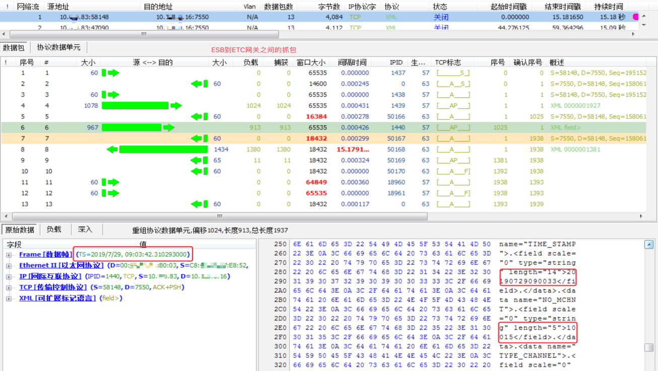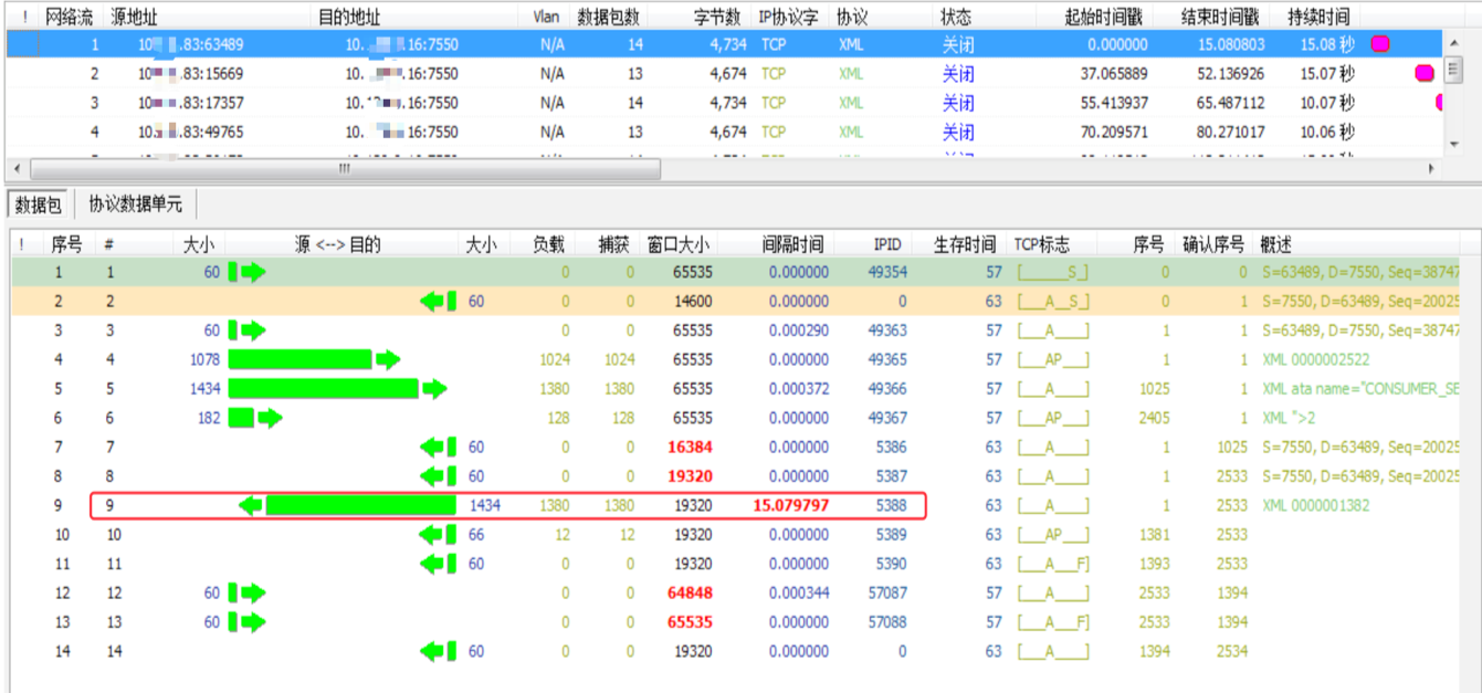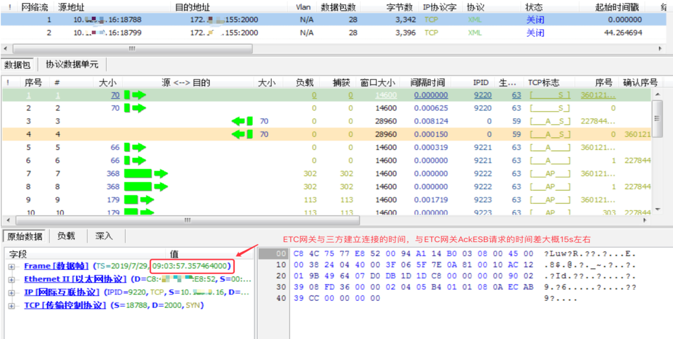 4)在数据包采集系统抓取采集点2和采集点3同一时间段的流量,因为从ESB到ETC网关发送的是XML数据,而从ETC网关到三方系统发送的是http数据,只能根据发送字段的相关信息来把采集点2和采集点3的同一笔交易进行关联,发现ETC网关在同三方系统开始建立三次握手的时间与ESB发送完请求的时间之间刚好差了15s左右。