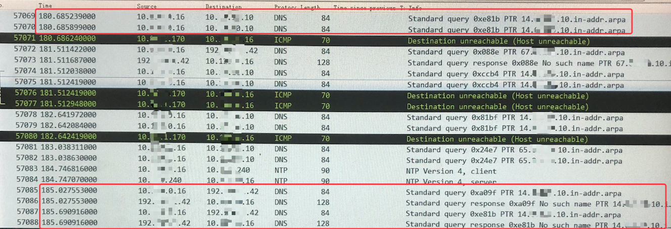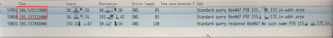 通过抓取ETC网关的数据包也可以验证,每次会先查询主DNS服务器10.*.*.10 ,超时时间为5s,连续超时之后再查询备DNS192.*.*.42,返回的信息是No such name。接着才开始和对端建立连接。