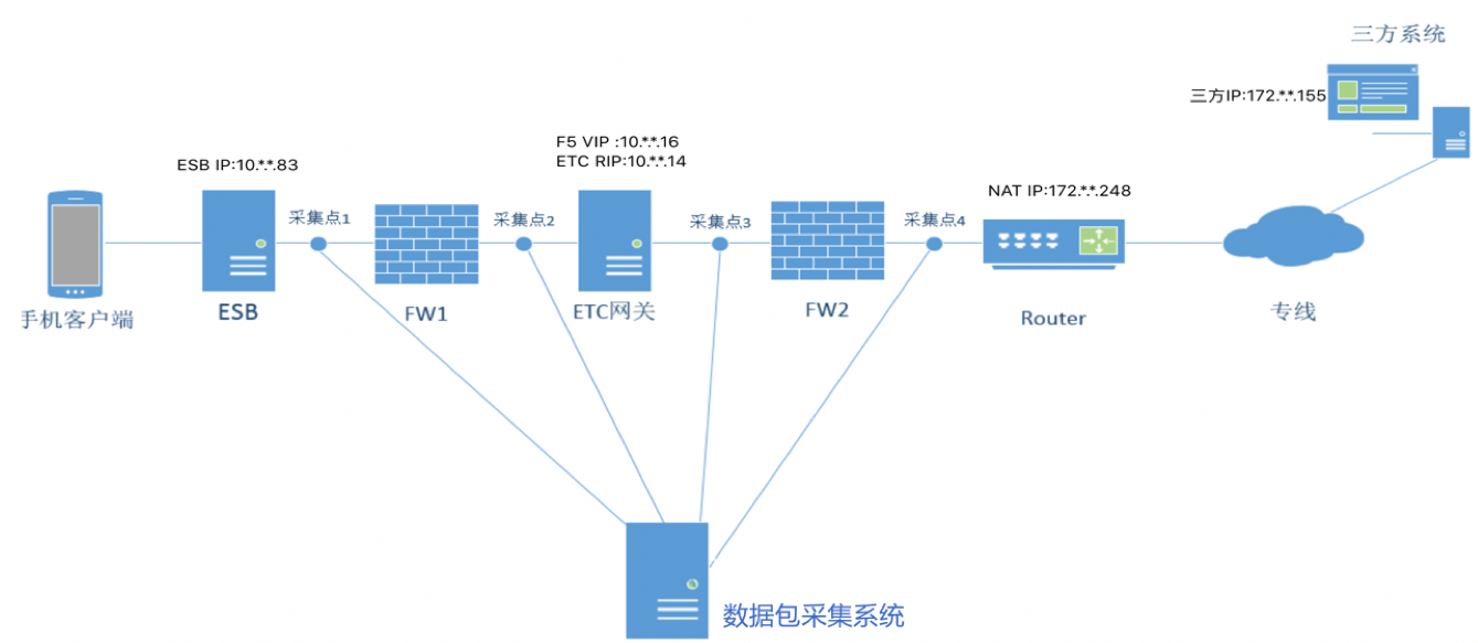 如下图所示,在采集点1、2、3、4分别部署了数据包捕获点,由数据包采集系统统一管理。