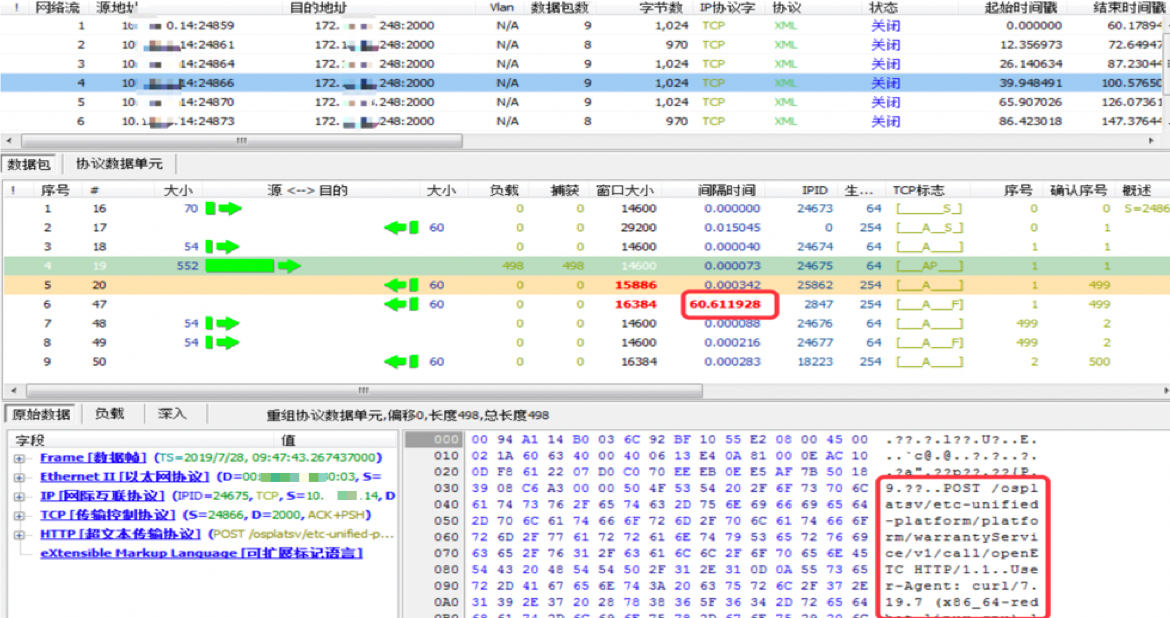可以看到10.*.*.14与172.*.*.248 三次握手正常建立,10.*.*.14发送了一个Post请求,172.*.*.248也对这个包,进行了确认,但没有发送响应,等到了60s超时后,248主动断开了连接。