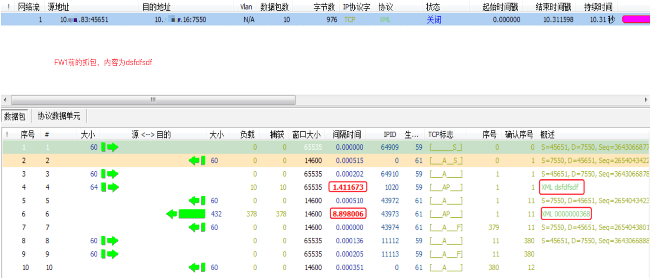 3)由于在ESB和ETC网关之间有防火墙FW1,为了排除是否由防火墙造成的延迟,在采集点1和采集点2中抓取同一会话进行对比,发现防火墙前后ETC网关响应的间隔时间差值2-3ms,故排除防火墙问题。