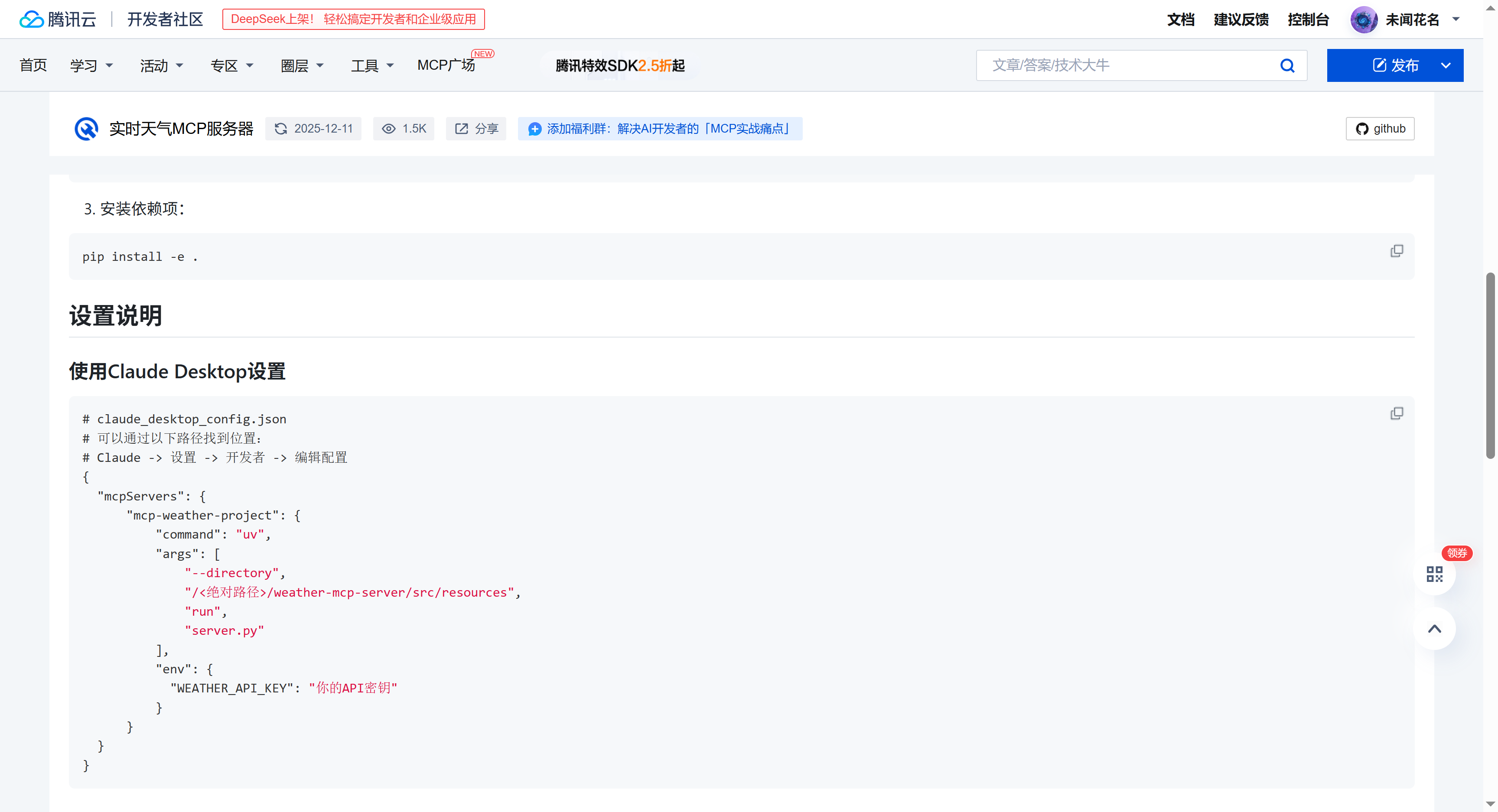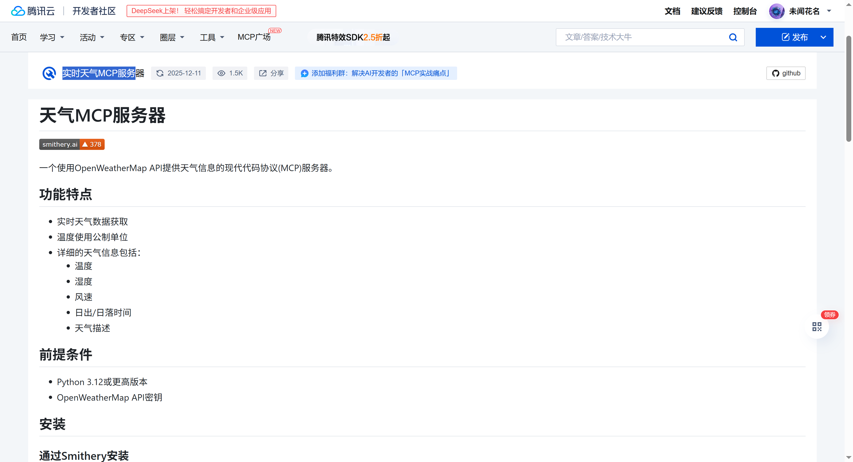 我们再找一个新的MCP服务试试,随机找到实时天气MCP服务,这是一个MCP服务器,通过开放天气地图(OpenWeatherMap)API 提供天气信息。