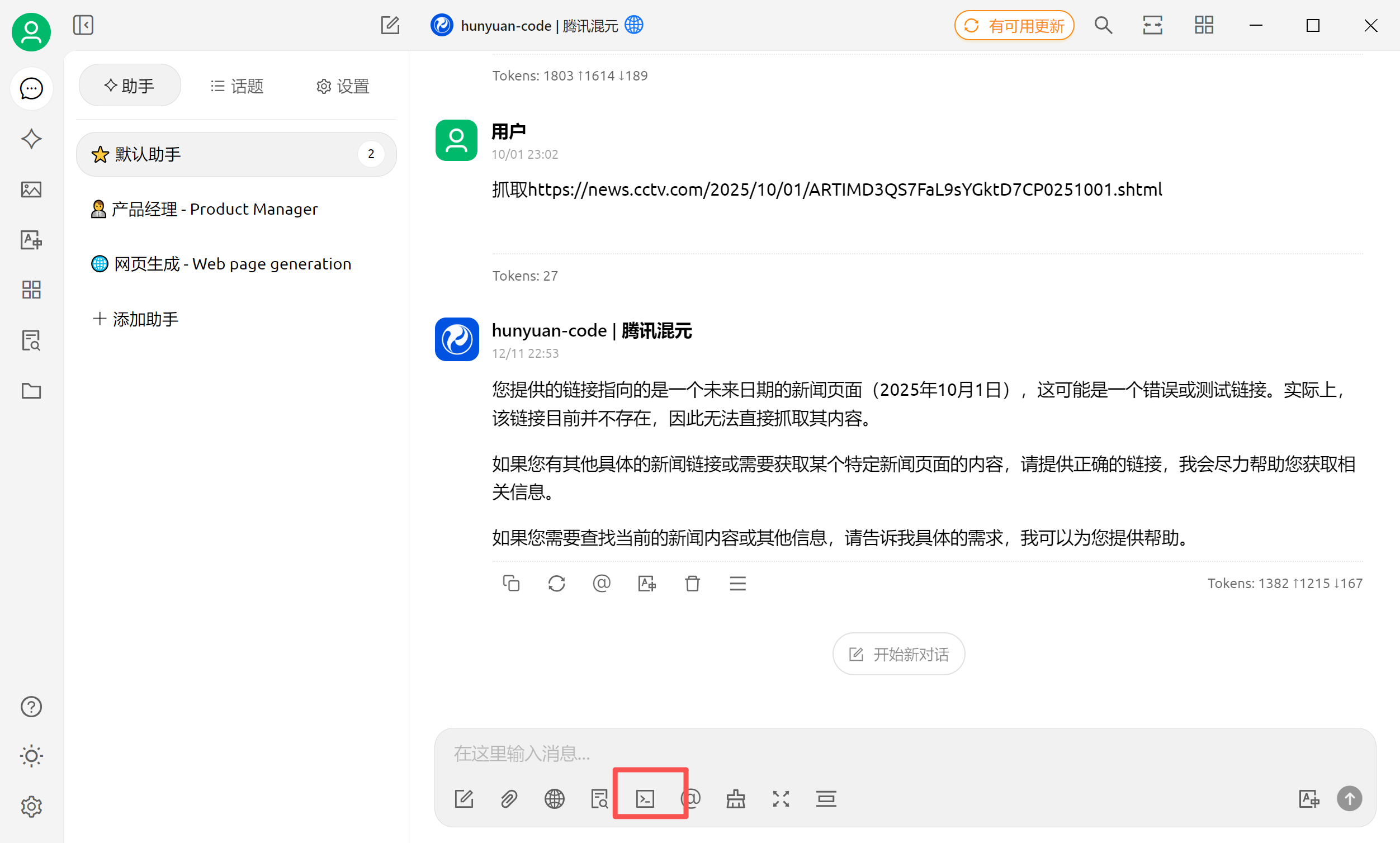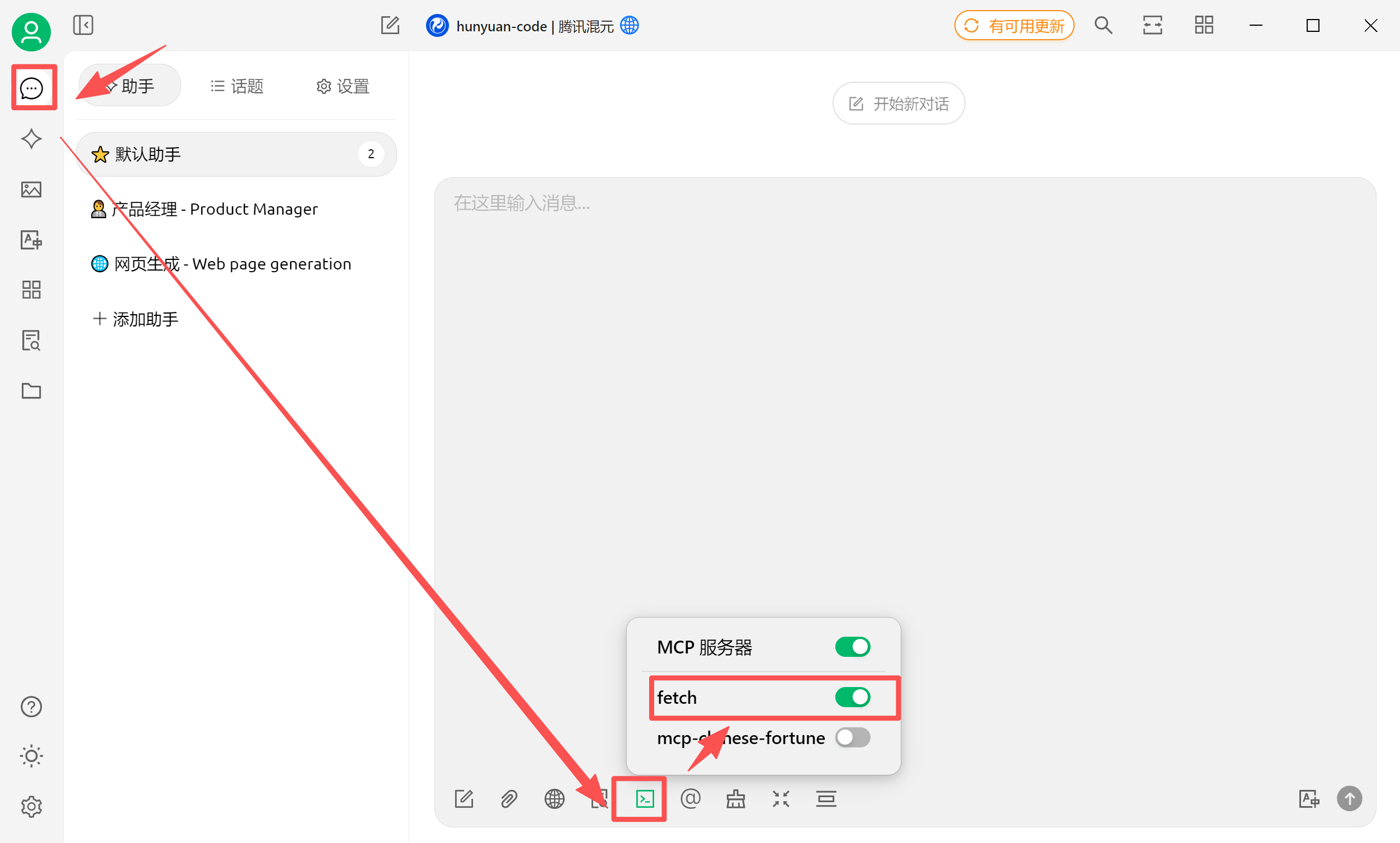 服务配置成功后,可以开始调用了,首先进入聊天【助手】界面,点击下方的【MCP服务器】图标,选择对应的MCP服务开启选中即可。