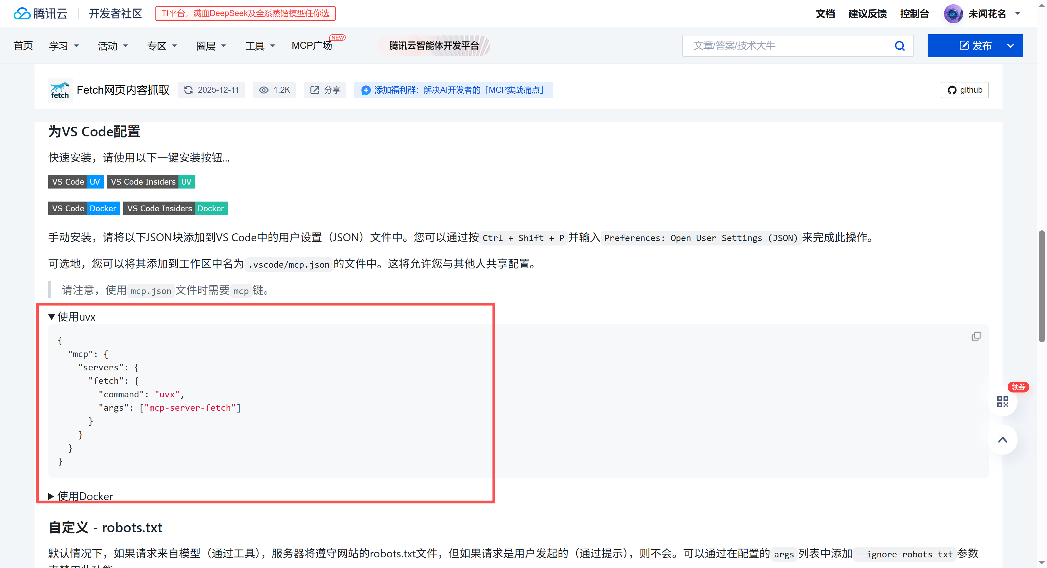 重点查看使用uvx配置的这段,找到关键信息: