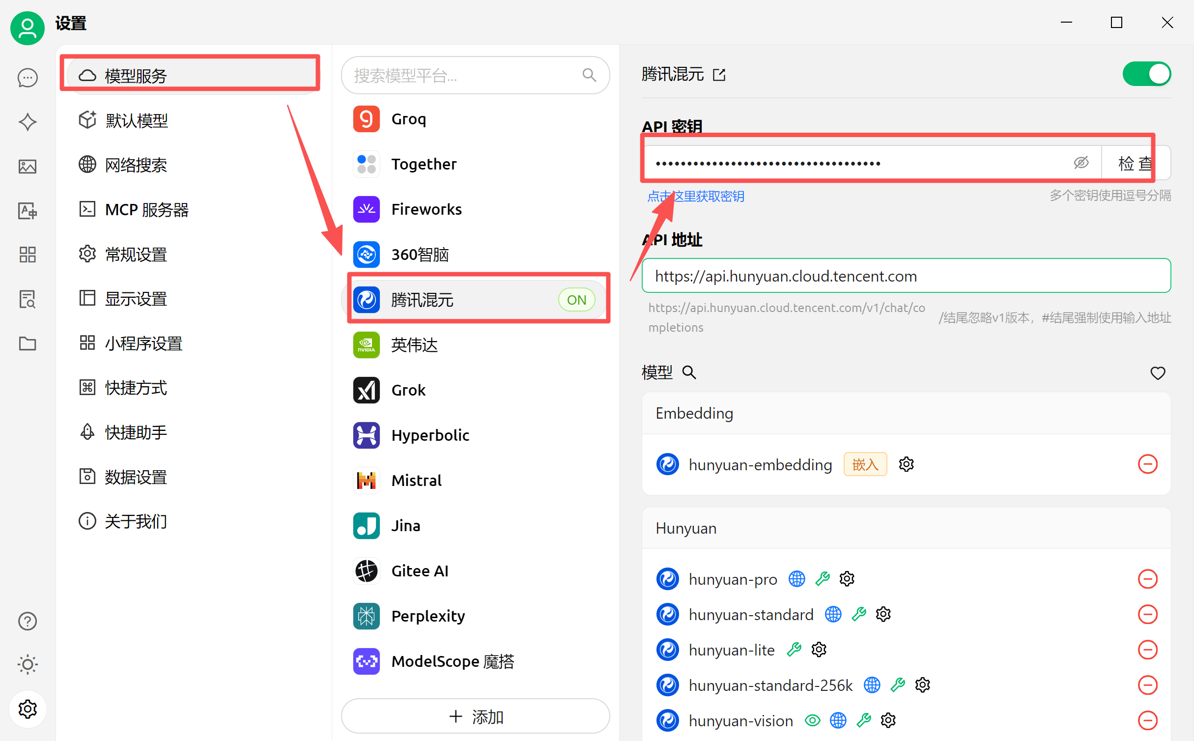 MCP调用也涉及到和模型的交互,也需要配置模型进行后续任务操作,可以配置ollama配置的本地模型,也可以配置现在比较主流的腾讯混元系列模型,此处我们以腾讯混元为例,选中【腾讯混元】后输入API密钥即可,密钥可通过腾讯云的控制台登录后申请获取,有一定量的免费使用权限可以申请,可相见博文第一篇。