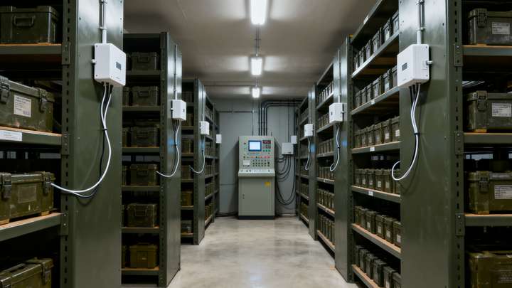 1. 陆军常规弹药库房:适配集团军 / 师级常规弹药(炮弹、子弹、手榴弹等)存储,依托防爆传感器 + 多渠道报警,满足《弹药安全管理条例》合规要求,解决人工巡检效率低的痛点。