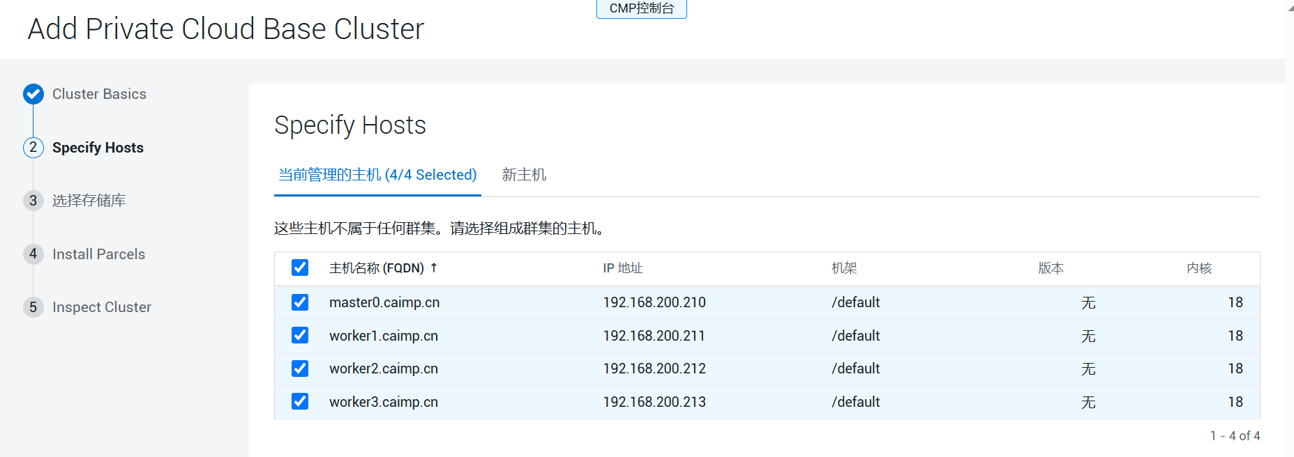 2. 点击“继续”,进入集群角色分配,一台机器作为管理节点,另外三台机器作为DataNode: 18