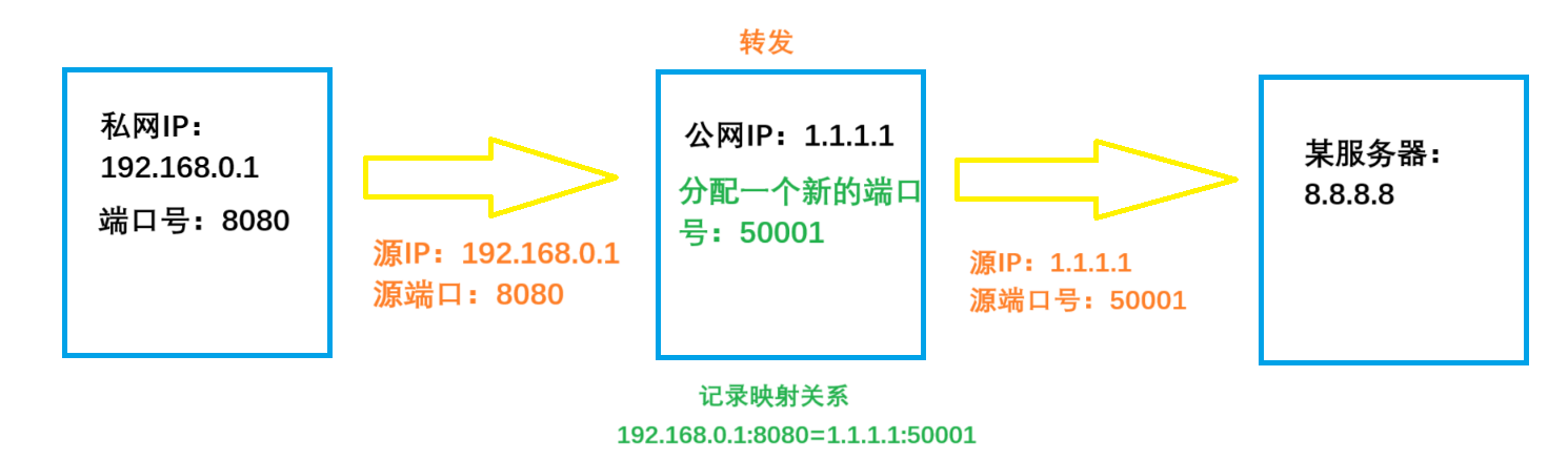 +-------------------+ +---------------------+ +---------------------+在NAT路由器中,存在一种映射关系,用于私网和公网之间的转换,不同的私网在使用公网IP时是通过端口号进行区分的。