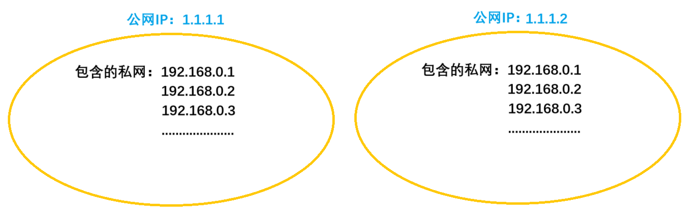 公网IP:除了上述的都是公网和私网的关系可以看做是一个包含关系,同一个局域网的私网IP使用同一个公网IP进行上网,公网的IP是唯一的,而私网的IP在不同的局域网中是可以重复的。