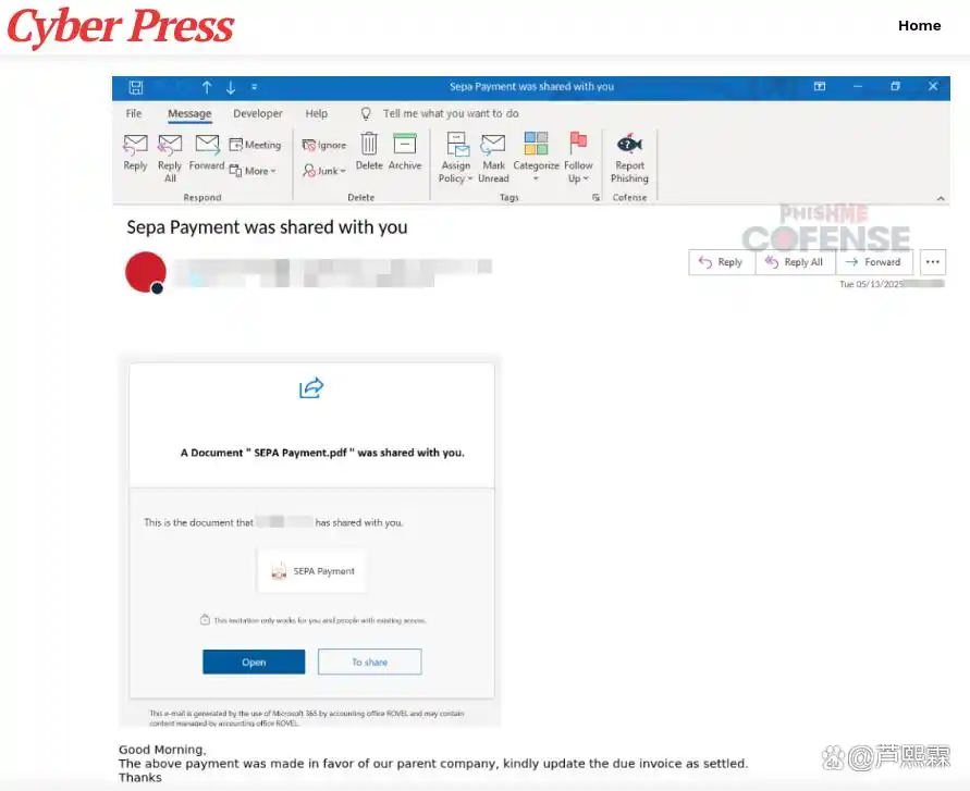 邮件内容模仿主流云服务(如OneDrive、SharePoint)的共享通知,内嵌HTML附件或短链接。HTML附件包含如下核心JavaScript代码: