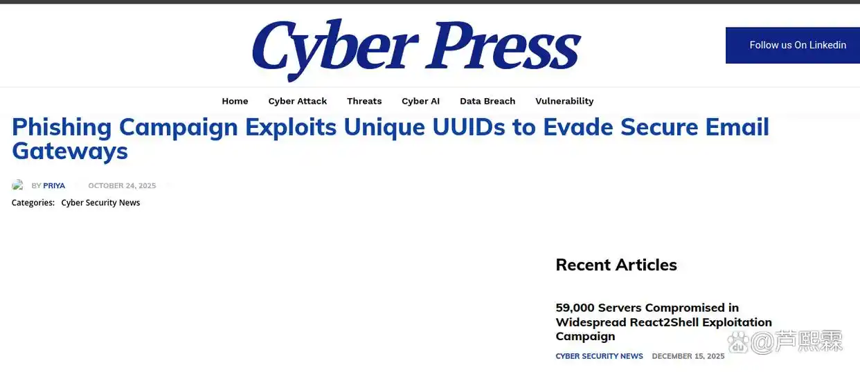 已有研究关注钓鱼URL的混淆技术,如短链接、Unicode同形异义字、参数污染等。Cofense(2025)首次报告了利用UUID绕过SEG的案例,指出攻击者使用硬编码域名列表与双UUID(campaign + session)机制。然而,现有文献多停留在现象描述,缺乏对攻击链完整建模与系统性防御方案的探讨。本文填补此空白。