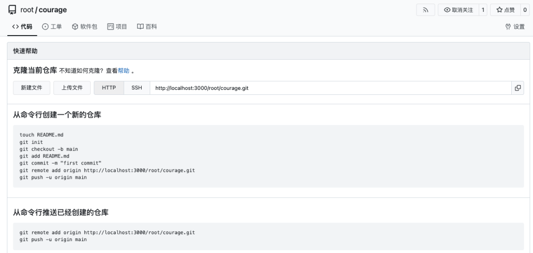 如图,创建仓库的界面和 Github 类似,输入仓库名,即可创建成功: