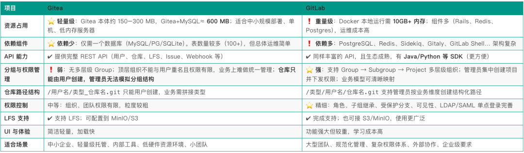 上图是笔者调研 Gitea 和 GItlab 的对比图,相比之下 ,Gitea 真是轻量级神器 ,能够完美适配公司业务的需求。