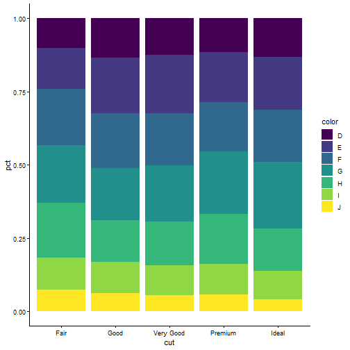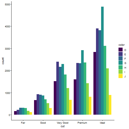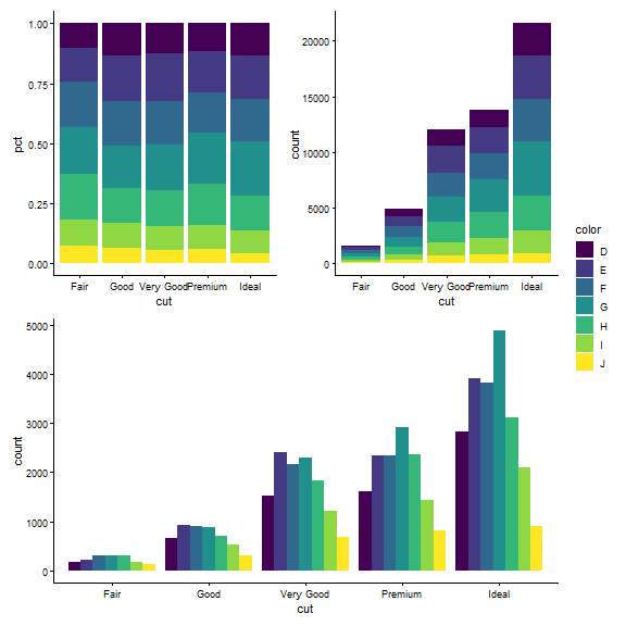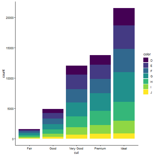 p2 <- ggplot(diamonds, aes(cut, fill = color)) +