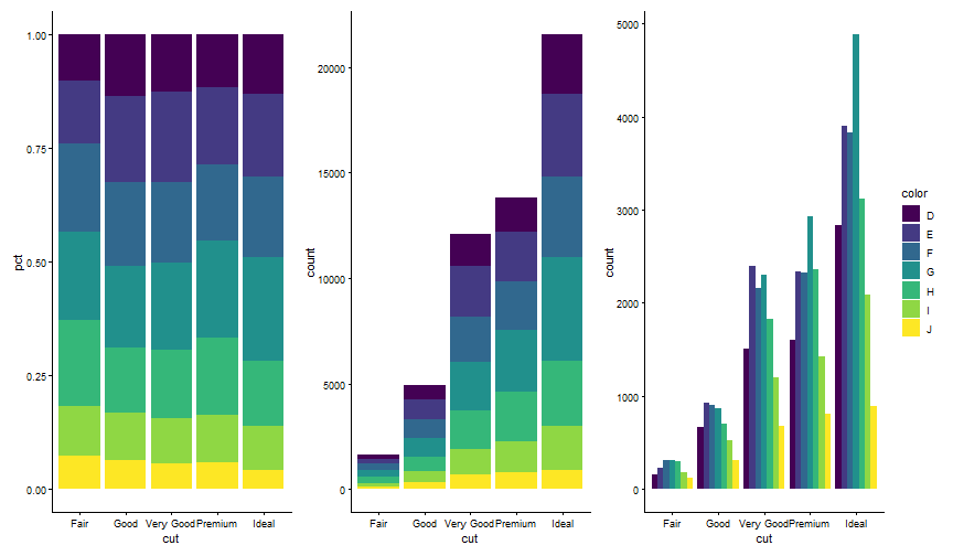 p3 <- ggplot(diamonds, aes(cut, fill = color)) +