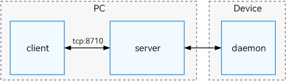 服务器(server):运行在电脑端的后台服务进程,用来管理客户端进程和设备端守护进程之间的数据交互,设备发现等。