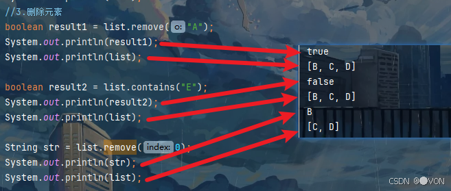 result1为true:因为集合中有A这个元素。 result2为false:因为集合中没有B这个元素。 str为B:list.remove(0)代表list中下标为0的元素。
