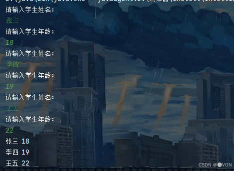 list.size() 返回列表中元素的个数,循环条件 i < list.size() 确保循环遍历到所有元素。list.get(i) 获取索引为 i 的 Student 对象。list.get(i).getName() 和 list.get(i).getAge() 分别获取当前 Student 对象的名字和年龄。System.out.println() 打印每个学生的姓名和年龄,使用 '\t' 进行姓名和年龄的分隔。