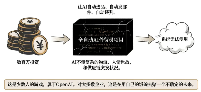 我见过一个做传统外贸的老板,被忽悠着要搞“AI+外贸”。他组建了一个技术团队,想做一个“全自动AI外贸员”,试图让AI自动选品、自动发邮件、自动谈判。结果呢?系统倒是做出来了,但根本没法用。因为AI不懂复杂的国际物流规则,不懂那些个国家微妙的风土人情,更不懂突发的供应链断裂以后该怎么处理。