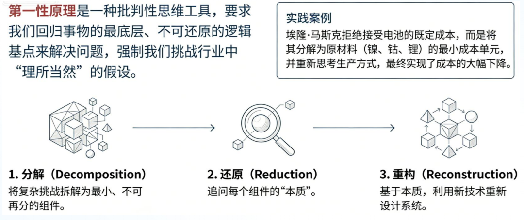 你看,第一性原理就像一把锋利的刀,能帮你剔除所有约定俗成、人云亦云的“脂肪”,直抵事物最核心的“骨骼”。
