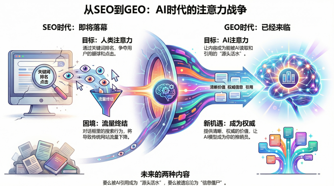 随着越来越多的搜索行为发生在对话框里,传统的网站流量必定会下降。未来的世界里,可能只有两种内容:一种是被 AI 读取并引用的“源头活水”,另一种是被 AI 遗忘在角落的“信息僵尸”。