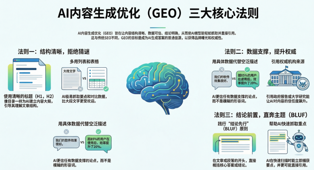 我把以上三个核心实操方法总结成GEO三大法则送给大家: