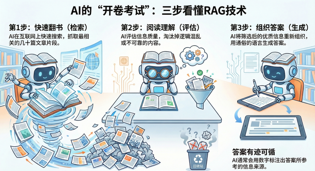 目前主流的 AI 搜索,普遍采用一种叫 RAG(检索增强生成) 的技术。大家先别被这个术语吓倒,它的原理其实非常简单,我们就拿一次“开卷考试”来做个类比: