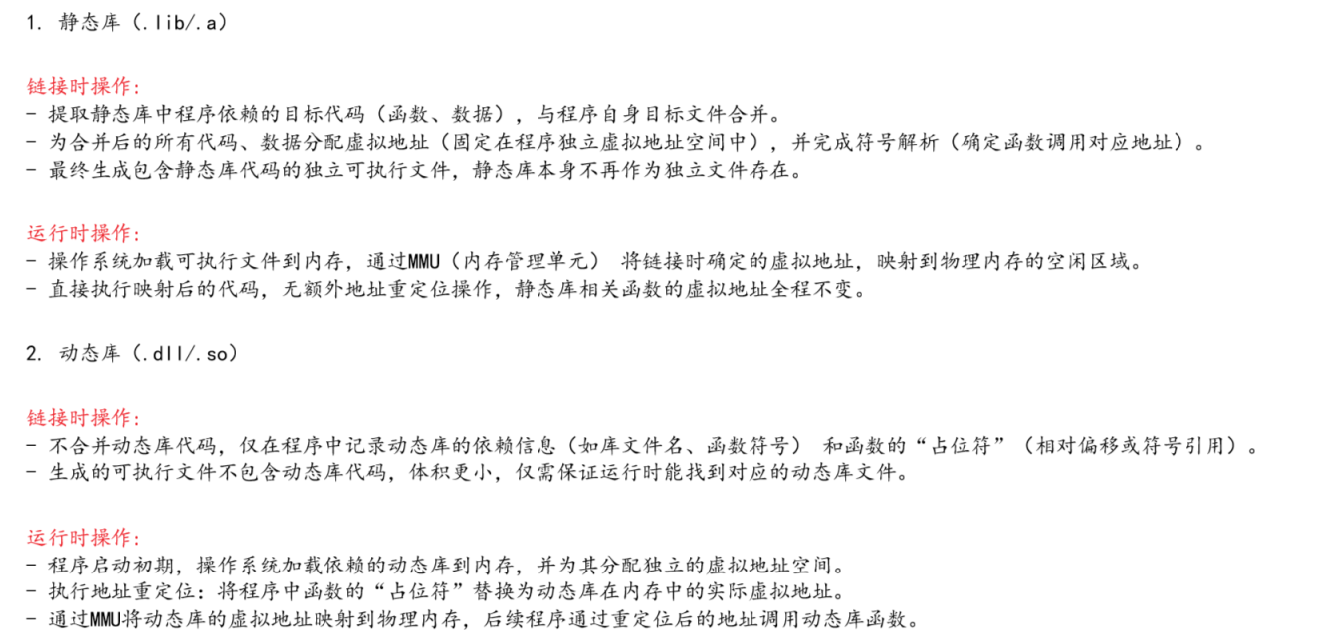 实际开发中,程序可采用混合链接(部分模块动态链接,部分静态链接)。比如,对核心功能模块链接静态库以保证独立性,对通用功能链接动态库以节省资源,但需通过复杂的编译选项或链接脚本精细控制,一般在对程序性能、体积和依赖有特殊要求的场景使用。
