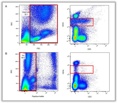 Fig. 1. 相同样本排除死细胞前后结果对比(A组未加死活染料染色,B组加入PI染料进行染色)
