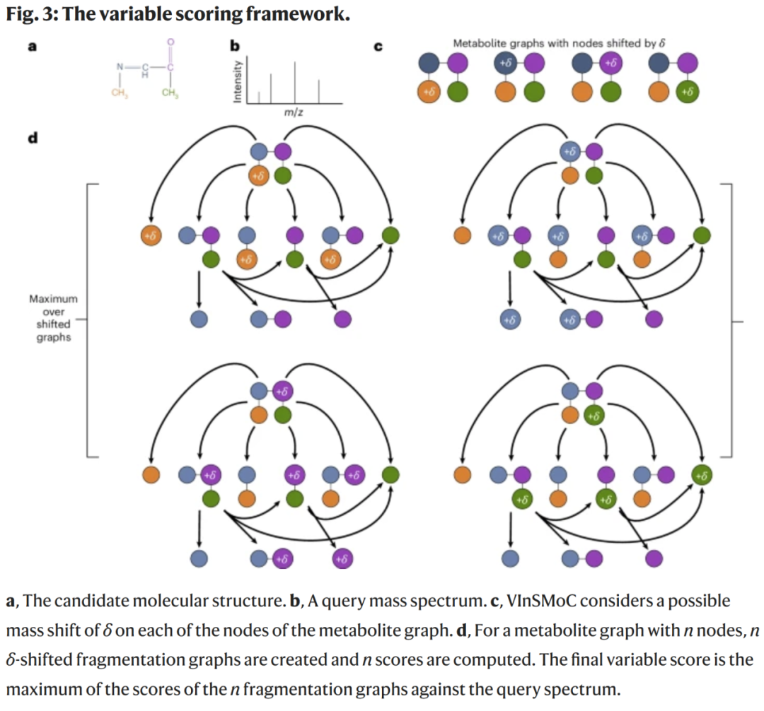 VInSMoC 以输入分子的分子结构构建 代谢图(metabolite graph),并在此基础上利用 自适应碎裂图(adaptive fragmentation graph) 生成理论碎裂。与传统一次性构建全碎裂图不同,VInSMoC 仅在某些碎片能解释光谱峰时才向更深层扩展,从而显著降低计算量。对于给定光谱与候选分子,VInSMoC 会对代谢图的每个节点施加一个可能的质量偏移 δ,用于模拟潜在化学修饰,并逐一计算匹配得分,最终选择最高分作为“可变得分”。得分的统计显著性通过马尔可夫链蒙特卡洛方法估计,以矫正结构拓扑带来的偏差。