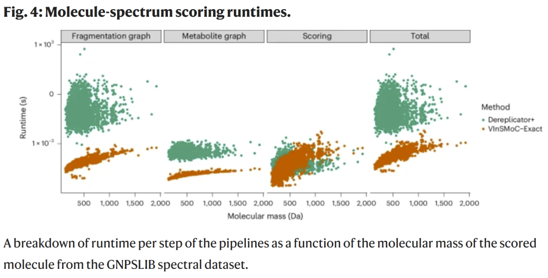 在 exact 模式下与多种主流方法比较,VInSMoC 均为最快工具;在可变搜索(open search)中,其速度甚至超过以往专用于肽类的 VarQuest。