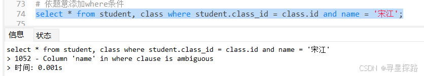 select * from student, class where student.class_id = class.id and student.name = '宋江';