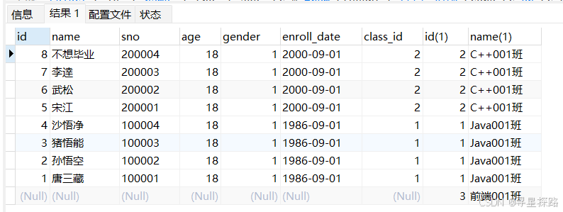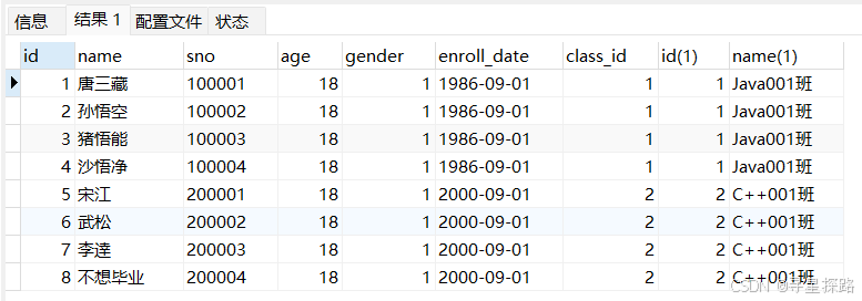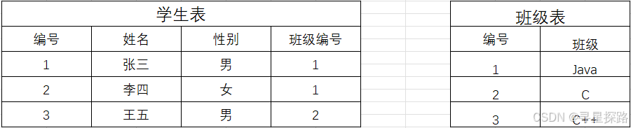 在数据设计时由于范式的要求,数据被拆分到多个表中,那么要查询⼀个条数据的完整信息,就要从多个表中获取数据,如下图所示:要获取学生的基本信息和班级信息就要从学生表和班级表中获取,这时就需要使用联合查询,这里的联合指的是多个表的组合。