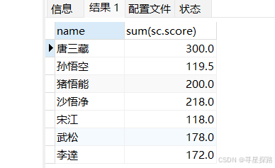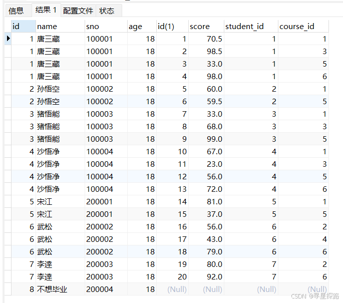 select 字段 from 表1 别名1 [inner] join 表2 别名2 on 连接条件 where 其他条件;(1)查询"唐三藏"同学的成绩
