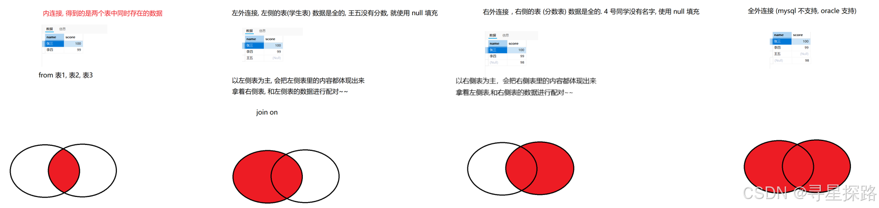 全外连接:结合了左外连接和右外连接的特点,返回左右表中的所有记录。如果某⼀边表中没有匹配的记录,则结果集中对应字段会显示为NULL。