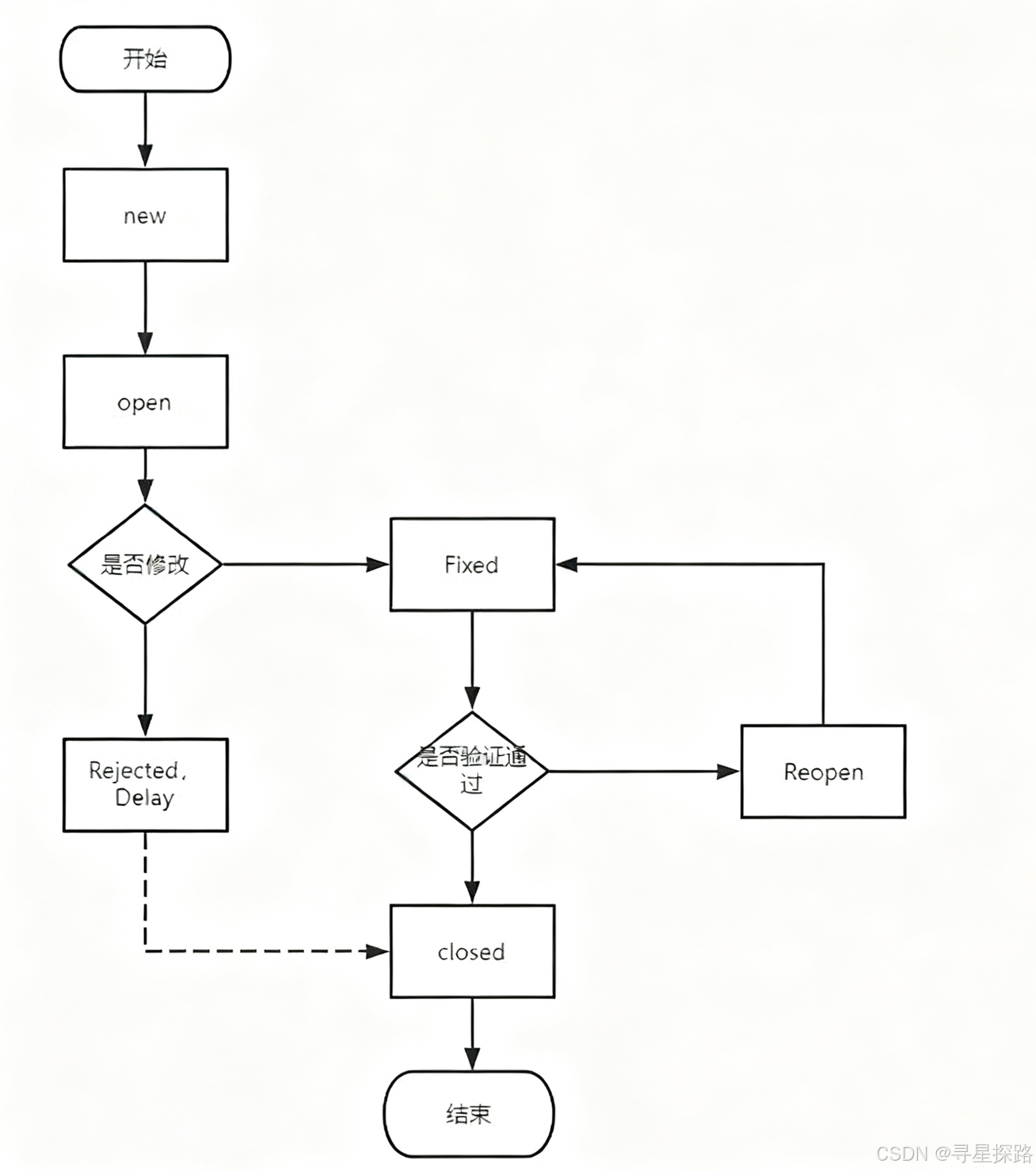 ●New:新发现的Bug,未经评审决定是否指派给开发人员进行修改。 ●Open:确认是Bug,并且认为需要进行修改,指派给相应的开发人员。 ●Fixed:开发人员进行修改后标识成修改状态,有待测试人员的回归测试验证。 ●Rejected:如果认为不是Bug,则拒绝修改。 ●Delay:如果认为暂时不需要修改或暂时不能修改,则延后修改。 ●Closed:修改状态的Bug经测试人员的回归测斌验证通过,则关闭Bug。 ●Reopen:如果经验证Bug仍然存在,则需要重新打开Bug,开发人员重新修改。 ⽆效的bug:open->closed open-rejected-closed