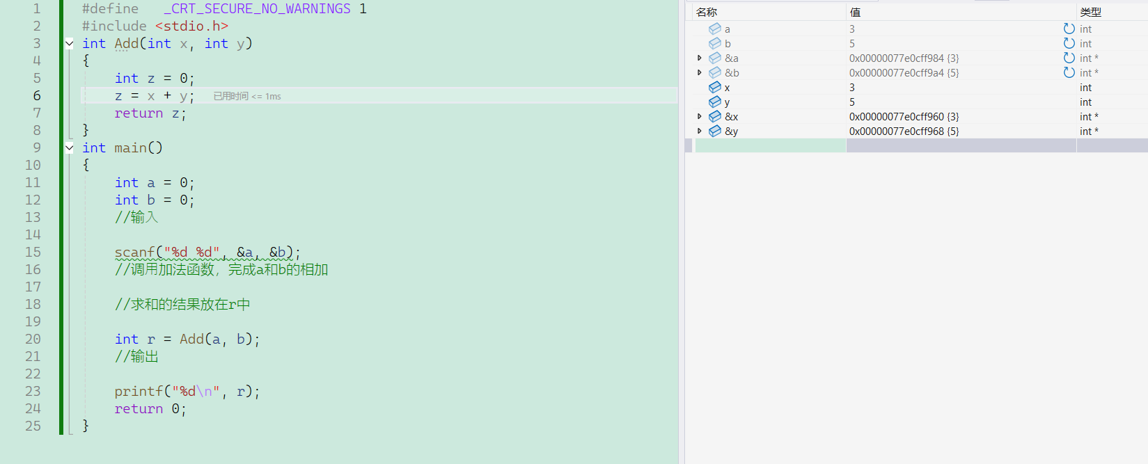 }以上完整的代码中,int Add(int x, int y)就是一个函数,其中要返回x+y的值,所以返回类型为int,也就是返回一个整数,Add则是这个函数的函数名,( )内部则分别是将输入的数据a和b进行传参,分别用x和y接收(参数的类型,数量要保持一致)。