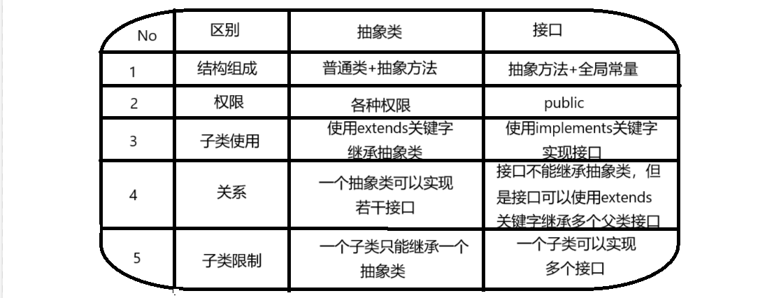 }核⼼区别:抽象类中可以包含普通方法和普通字段,这样的普通方法和字段可以被子类直接使用(不必重写), 而接口中不能包含普通方法,子类必须重写所有的抽象方法.