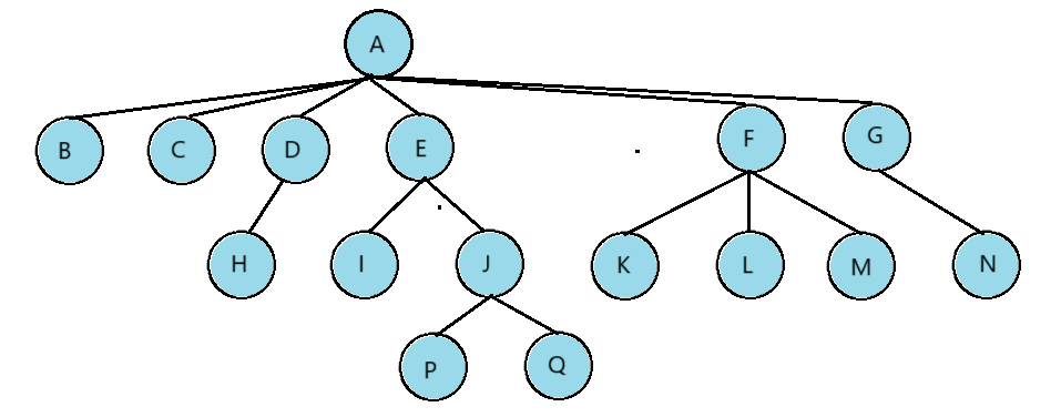 子孙:以某结点为根的子树中任一结点都称为该结点的子孙。如上图:所有结点都是A的子孙