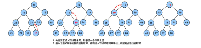 (2)将最后新插入的节点向上调整,直到满足堆的性质
