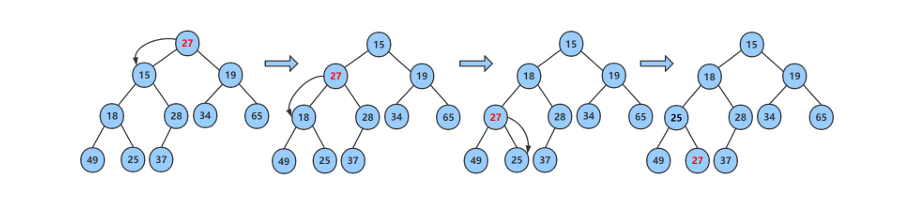 对于集合{ 27,15,19,18,28,34,65,49,25,37 }中的数据,如果将其创建成堆呢?