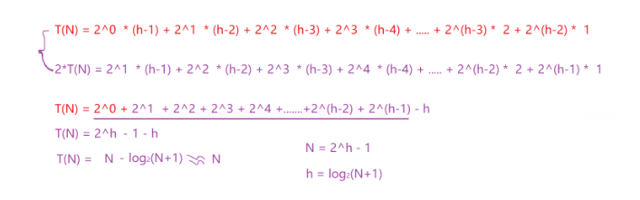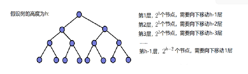 }因为堆是完全二叉树,而满二叉树也是完全二叉树,此处为了简化使用满二叉树来证明(时间复杂度本来看的就是 近似值,多几个节点不影响最终结果):